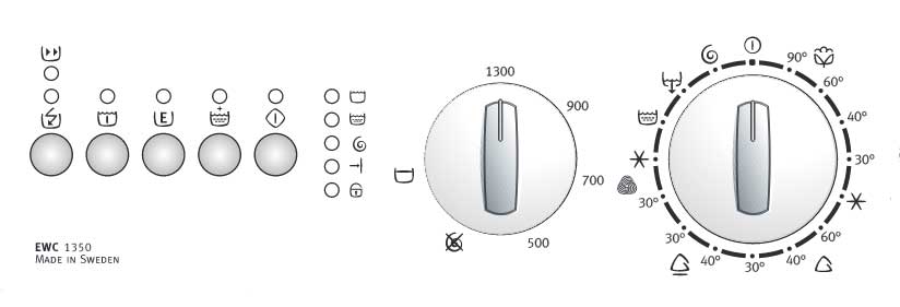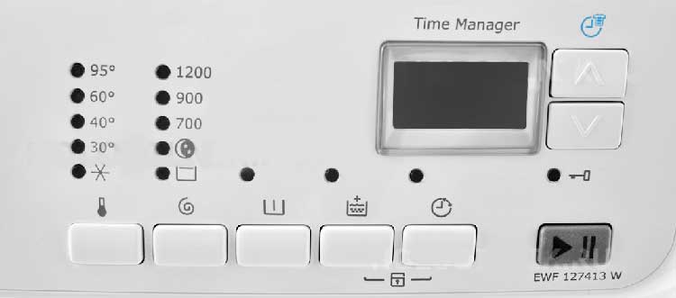 Панель Electrolux на базе модуля управления EWM1000 В моделях, оснащенных модулем EWM 1000, код можно определить по двум лампочкам, размещенным у кнопок START/PAUSE (1-ый) и «Завершение стирки» (2-ой).