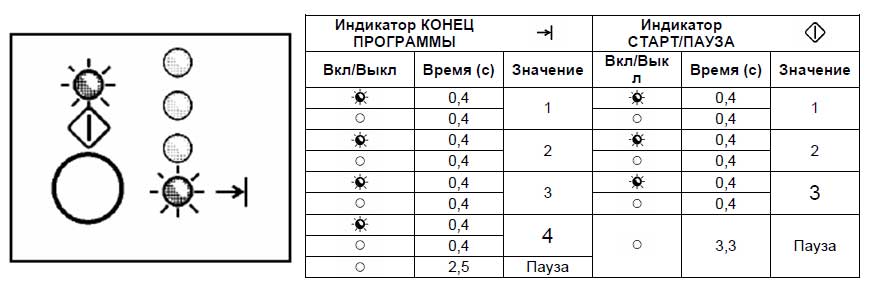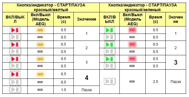 Панель Electrolux на базе модуля управления EWM11xx, EWM21xx, EWM25xx, EWM35xx Индикация кодов неисправности выполняется с помощью последовательности миганий индикатора СТАРТ/ПАУЗА красного и зеленого цвета (0,5 секунды включено, 0,5 секунды выключено, пауза между последовательностями 2,5 секунды). Индикатор СТРАТ/ПАУЗА красного цвета - соответствует первой цифре кода неисправности (семейство). Индикатор СТАРТ/ПАУЗА зеленого цвета - соответствует второй цифре кода неиспранвости (номер в семействе). Эти два индикатора имеются на всех моделях.