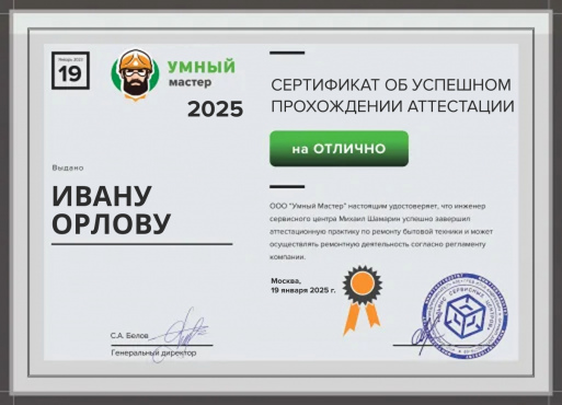 19 января 2025 года Иван Орлов успешно завершил ежегодную аттестационную практику в нашем сервисном центре, тем самым подтвердил свою квалификацию.
