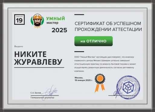 19 января 2025 года Никита Журавлев успешно завершил ежегодную аттестационную практику в нашем сервисном центре, тем самым подтвердил свою квалификацию.